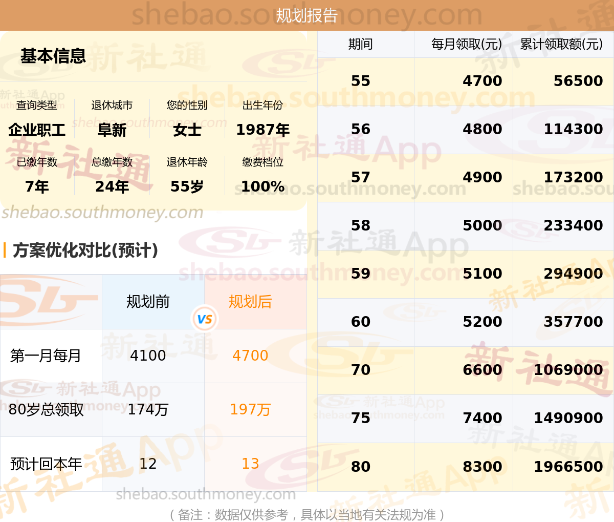 规划前:55岁第一个月约领4100元,新社通APP-养老金规划后:55岁第一个月约领4700元