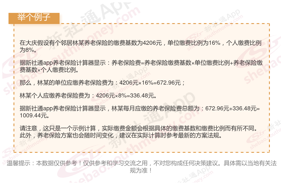 据新社通app养老保险计算器显示,个人缴费金额=缴费基数×个人缴费比例=4206元×8%=336.48元/月。