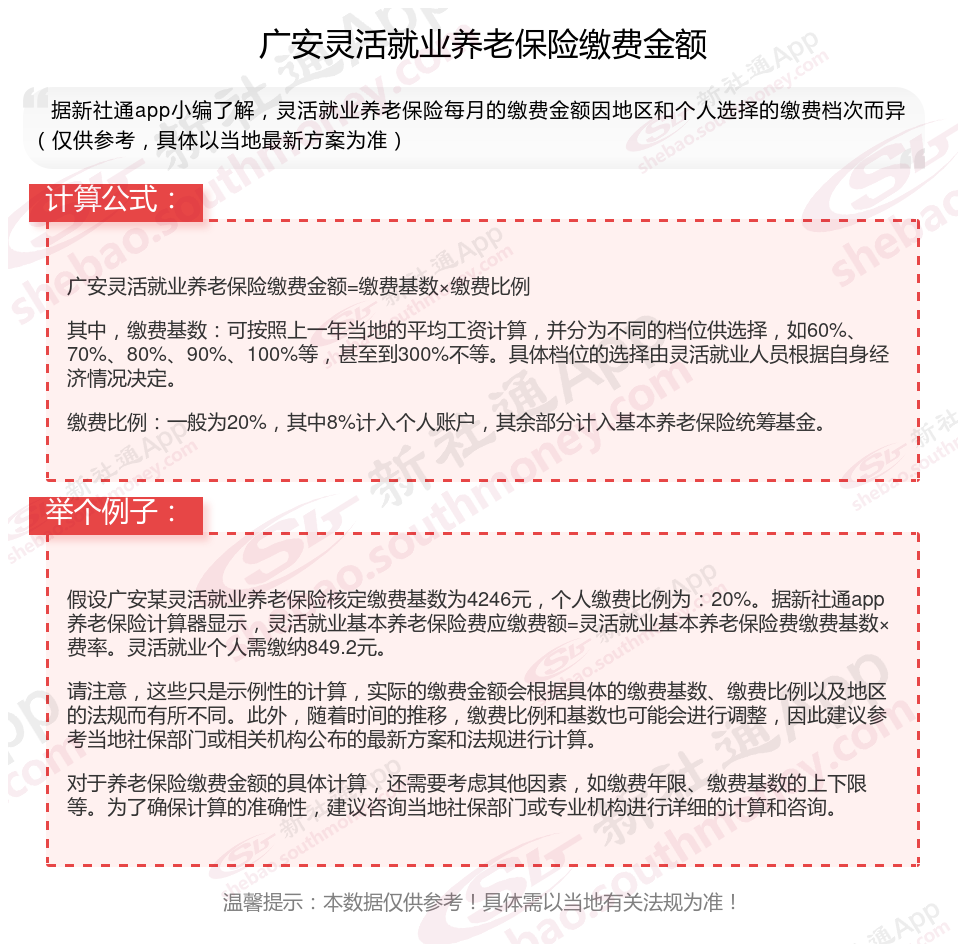 据新社通app显示,广安灵活就业人员养老保险缴费基数2024-2025年最新标准如下: