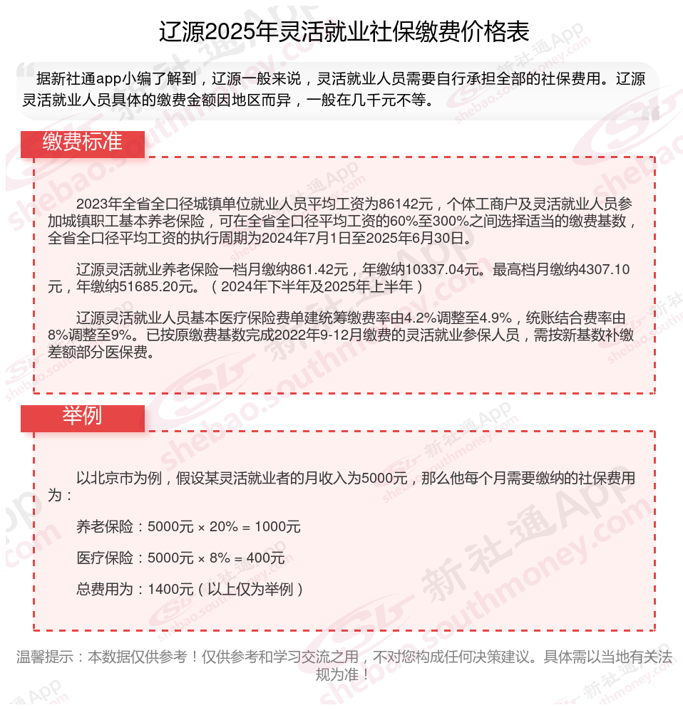 辽源灵活就业者社保缴纳金额怎么计算?根据新社通app-社保缴费查询工具提供的最新数据如下: