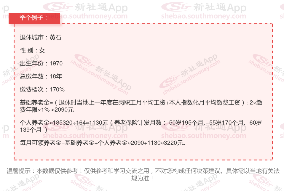 笔友朱某退休城市在黄石,性别:女,出生年份:1970,总缴年数18年,缴费档次:170%,新社通app养老金计算器所得:
