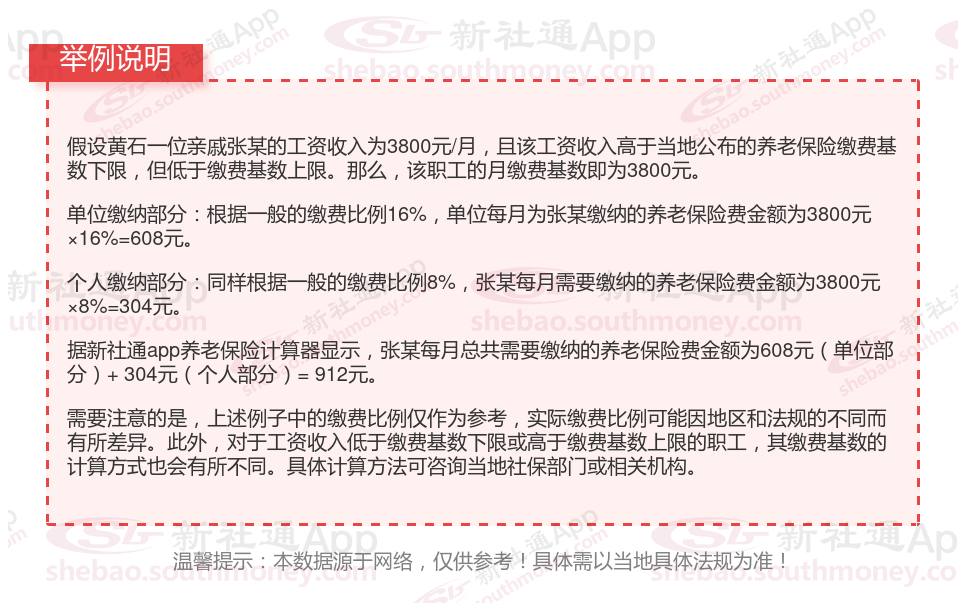 据新社通app获悉,黄石职工养老保险缴费金额的计算涉及到企业缴费额和职工个人缴费额两部分。以下是一个基于黄石的职工养老保险缴费金额计算示例: