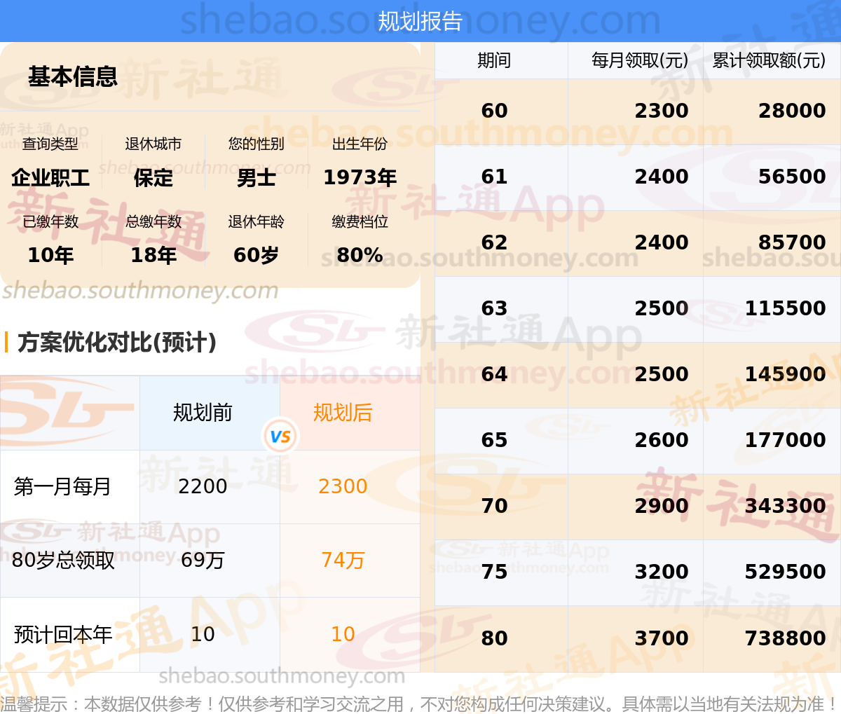 参保城市:保定,性别:男士,出生年月:1973,已缴年限:10年,总缴年数:18年,退休年龄:60岁,缴费档位:80%。