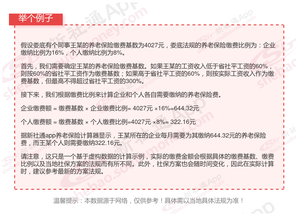 据新社通app获悉,娄底养老保险缴费金额的计算通常基于缴费基数和缴费比例。以下是一个具体的计算举例: