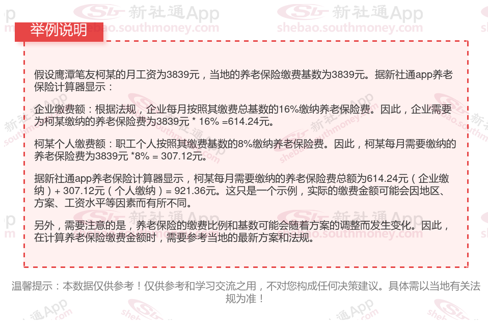 假设鹰潭某职工的工资总额为3839元,那么他的缴费基数就是3839元的60%到300%之间。如果他选择按照缴费基数为3839,据新社通app养老保险计算器测算显示,他的个人缴费额就是3839元*8%,等于307.12元。