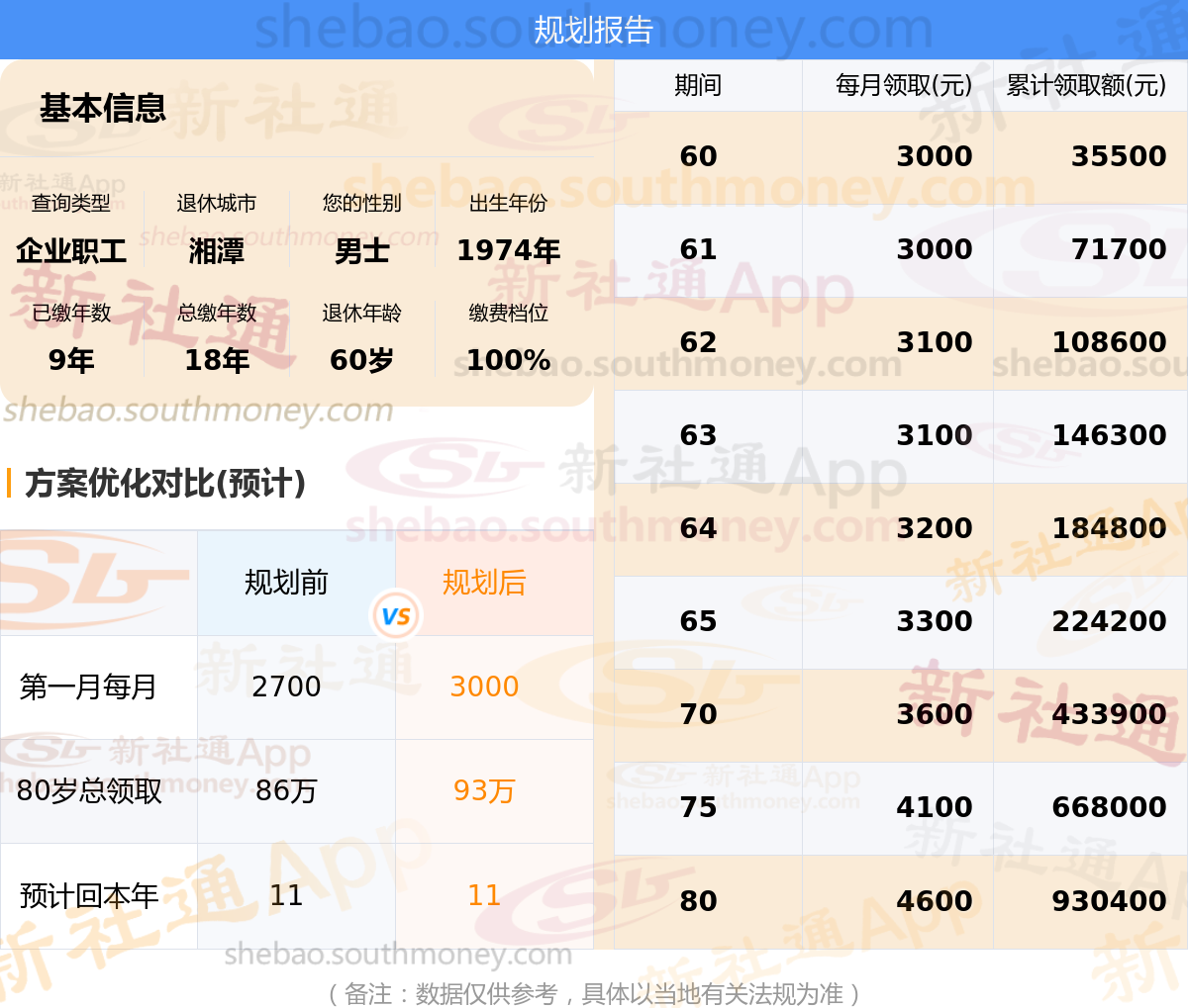 规划前:参保城市:湘潭,性别:男士,出生年月:1974,已缴年限:9年,总缴年数:18年,退休年龄:60岁,缴费档位:100%。