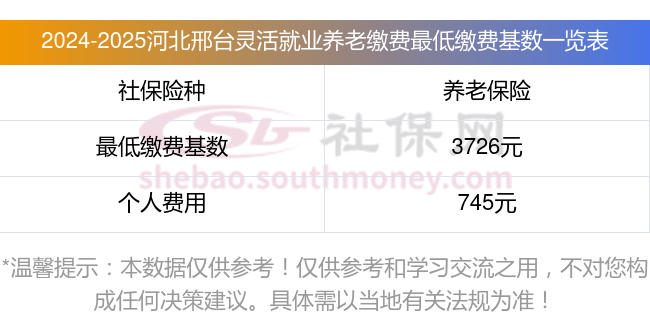 据新社通app小编了解,灵活就业人员的社保缴费金额会根据个人的收入水平和当地的方案有所不同。下面随新社通小编一起来看看河北邢台2024-2025灵活就业养老保险社保缴费价格表,灵活就业养老保险一个月多少钱的详情吧。
