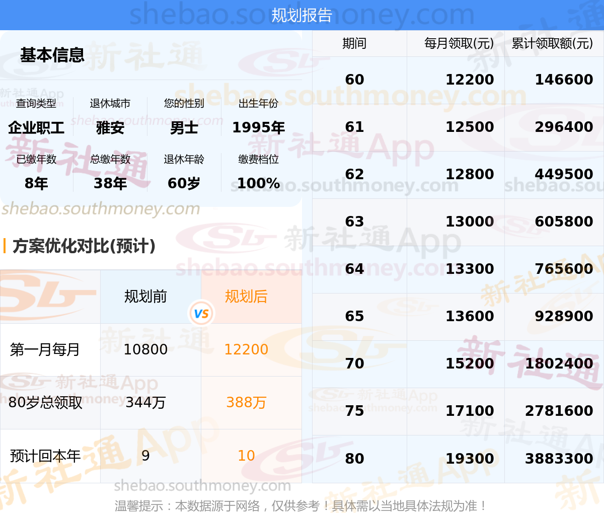 规划前:60岁第一个月约领10800元,新社通APP-养老金规划后:60岁第一个月约领12200元