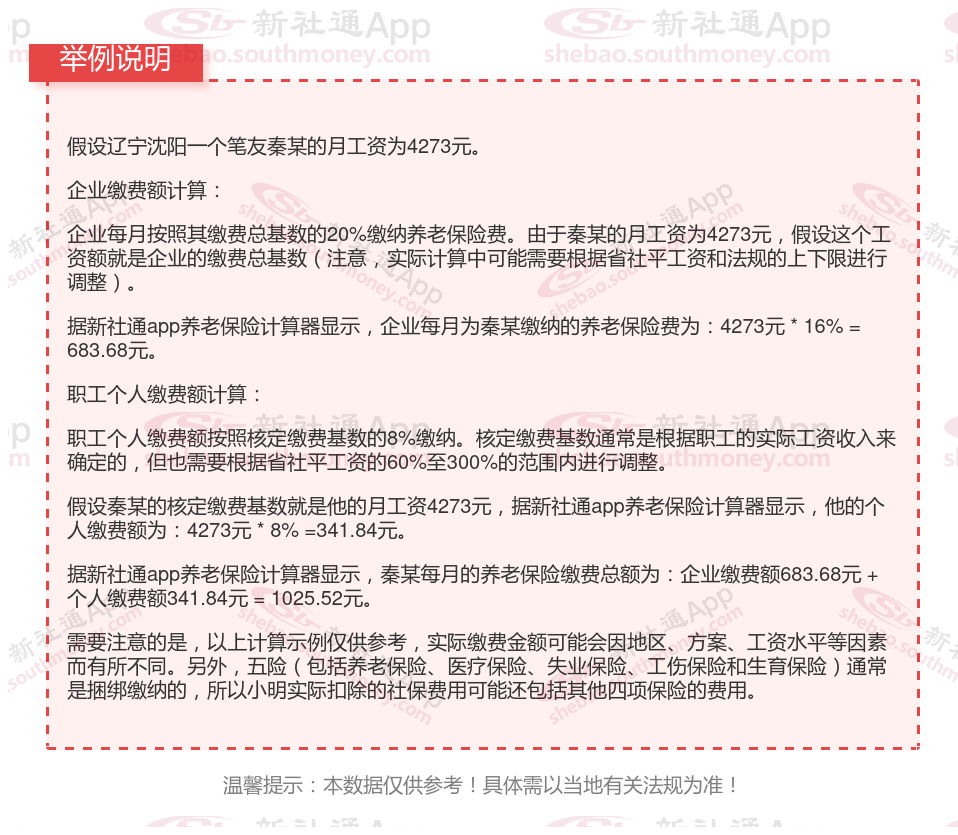 假设辽宁沈阳的养老保险缴费基数为4273元,个人按照8%的比例缴纳养老保险费用,企业按照16%的比例缴纳。则该职工的养老保险缴费计算如下: