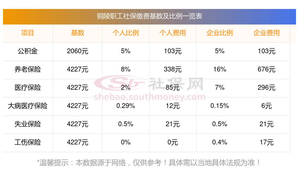 安徽社保个人怎么交费?下表是2024-2025年铜陵社保费用明细参考,新社通app-社保缴费查询工具提供的最新数据如下: