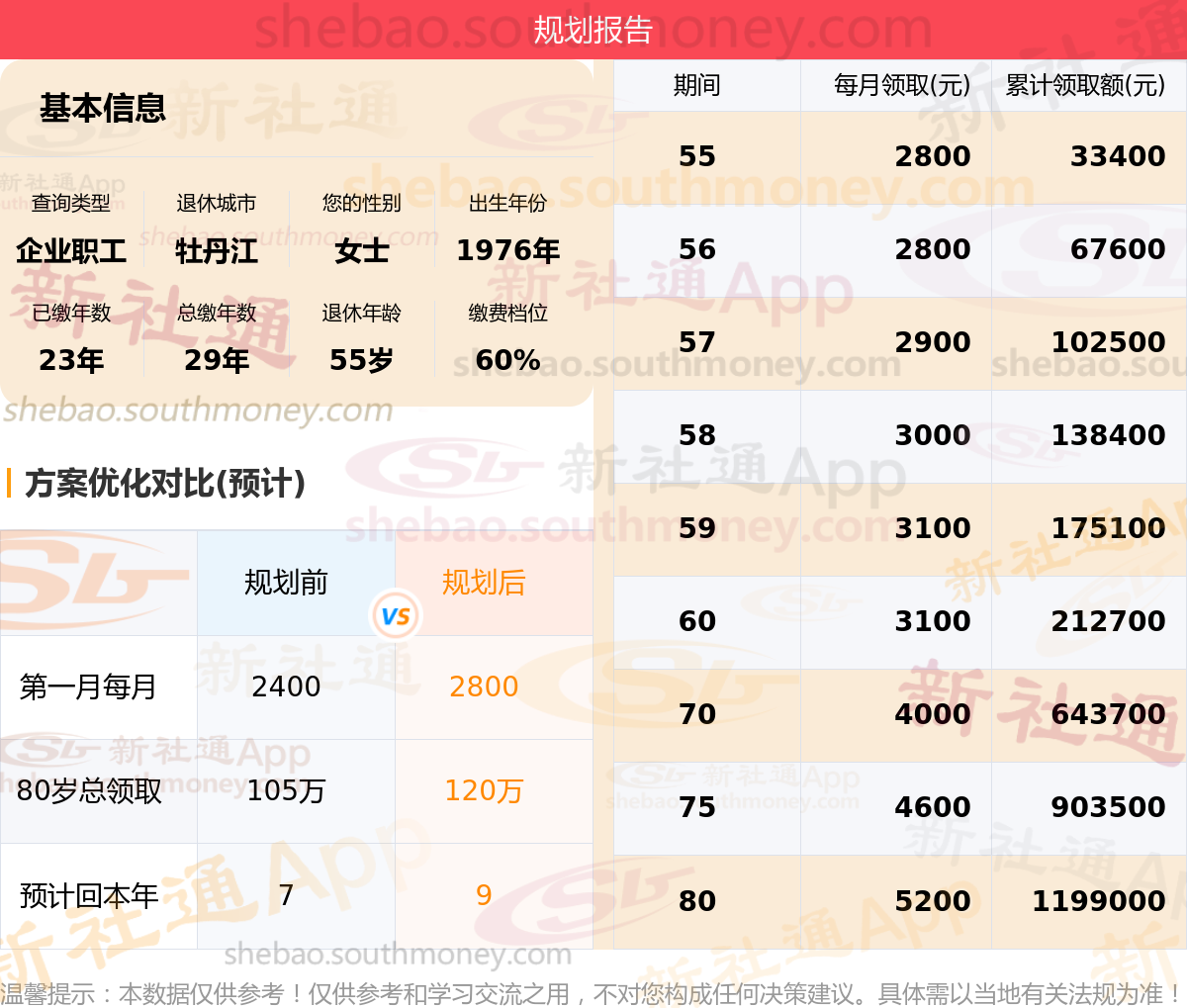 规划前:55岁第一个月约领2400元,新社通APP-养老金规划后:55岁第一个月约领2800元