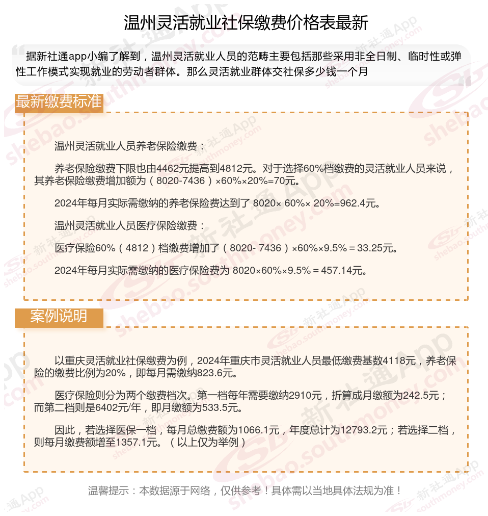 据新社通app数据显示,温州灵活就业人员养老缴费基数2024-2025年最新标准如下: