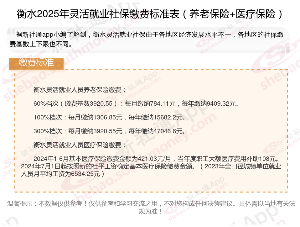 衡水社保缴费多少钱?下表是2024-2025年衡水社保费用明细参考,根据新社通app-社保缴费查询工具提供的最新数据如下: