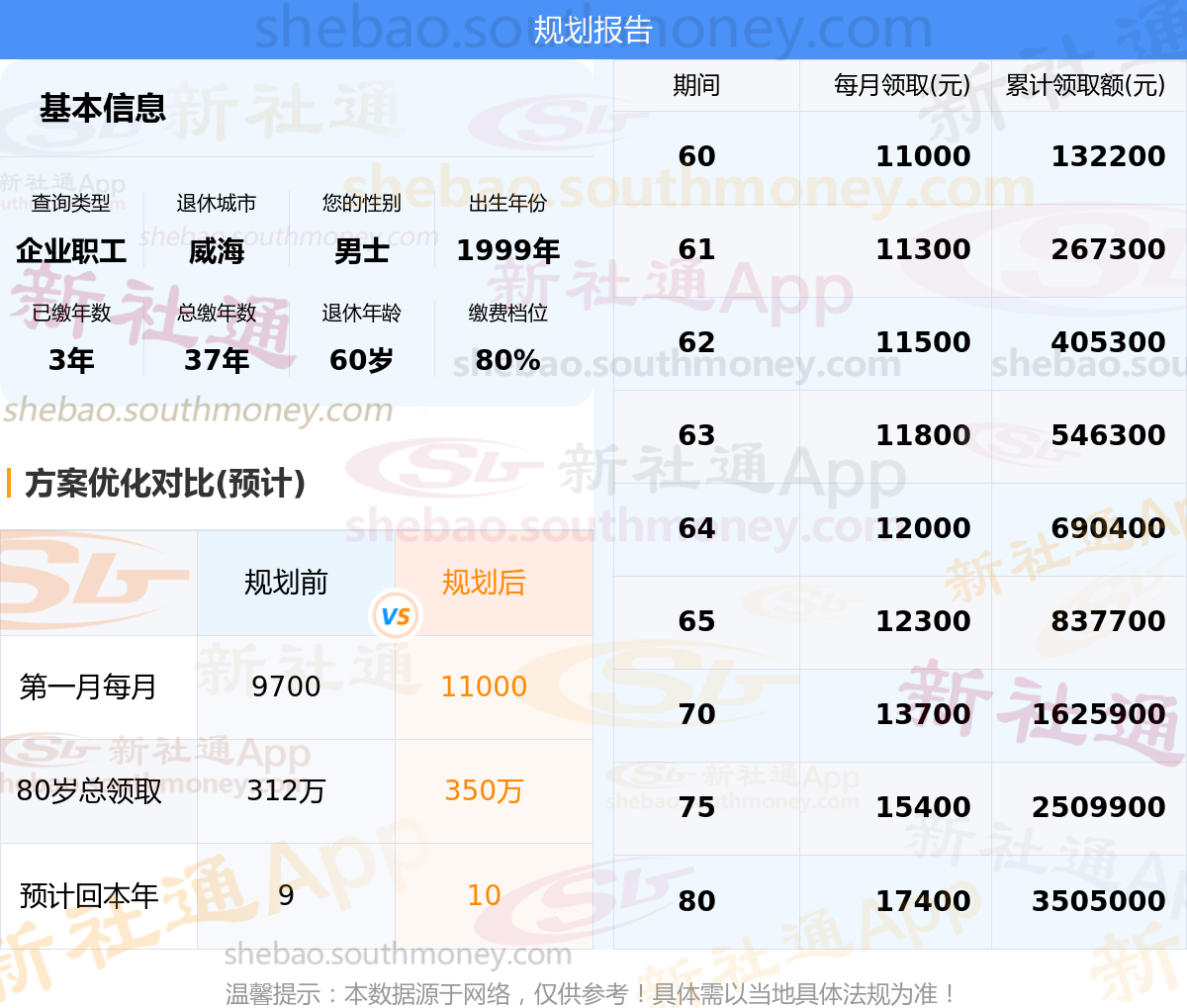参保城市:山东威海,性别:男士,出生年月:1999,已缴年限:3年,总缴年数:37年,退休年龄:60岁,缴费档位:80%。