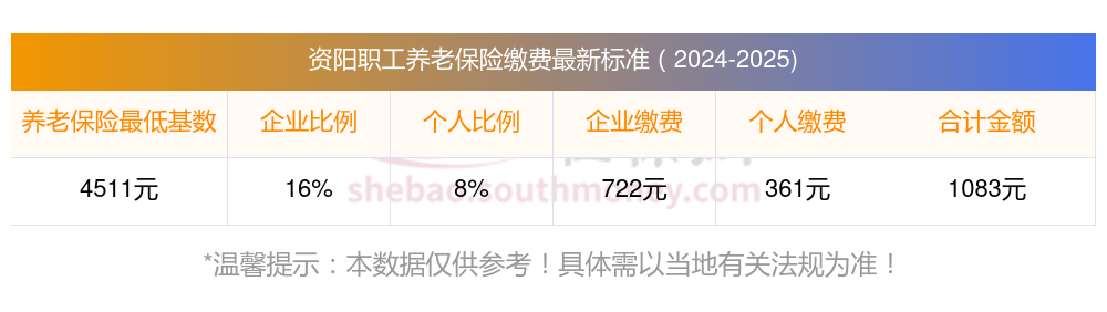 据新社通app获悉,一般情况下养老保险的缴费金额是根据当下的一个养老缴费基数来计算的。不同地区以及不同年份的养老缴费基数都是不一样的,每年都可以看到各地的养老缴费基数调整的消息。那么资阳养老缴费基数究竟是什么?下面随新社通app小编一起来看看资阳养老保险缴费比例个人和单位2024-2025是多少!