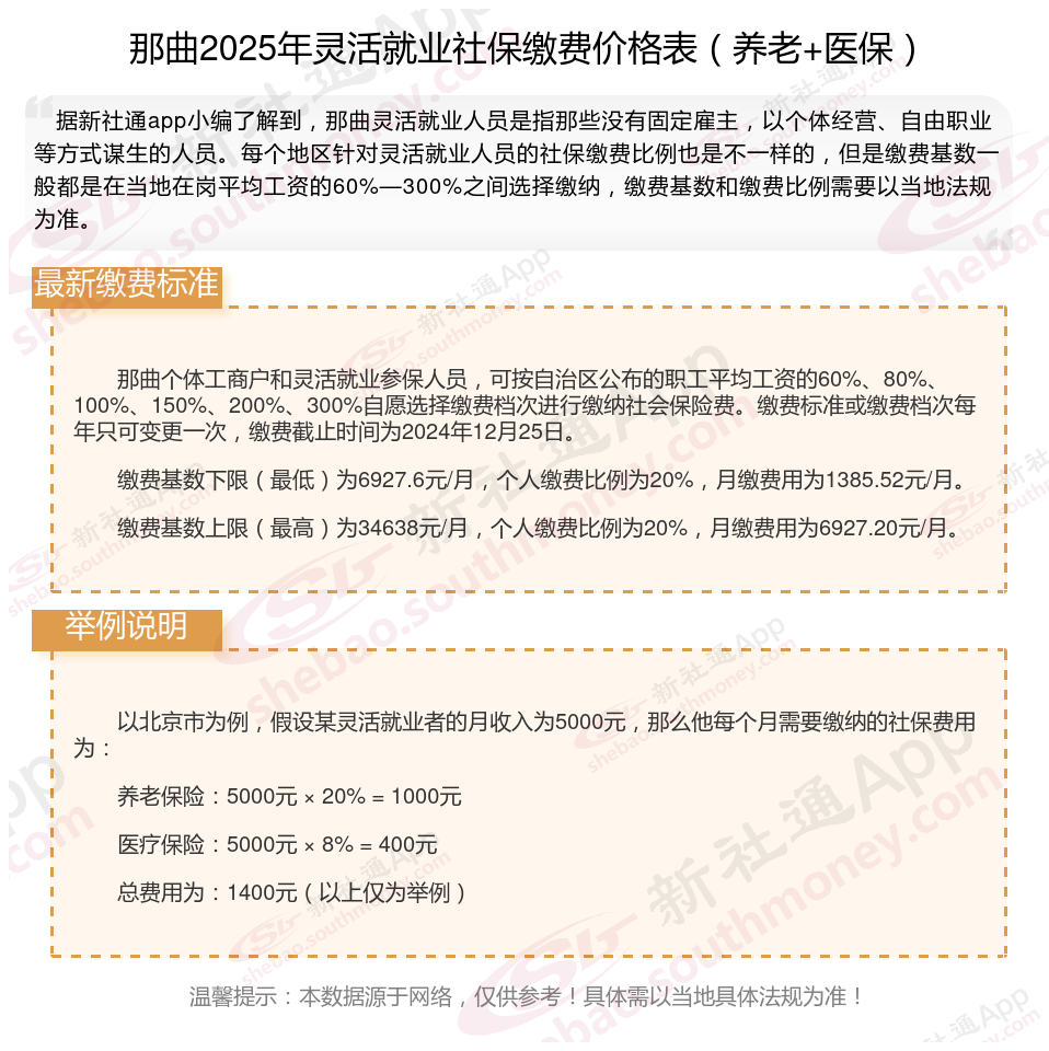 据新社通app数据显示,那曲灵活就业人员养老保险缴费基数2024-2025年最新标准如下: