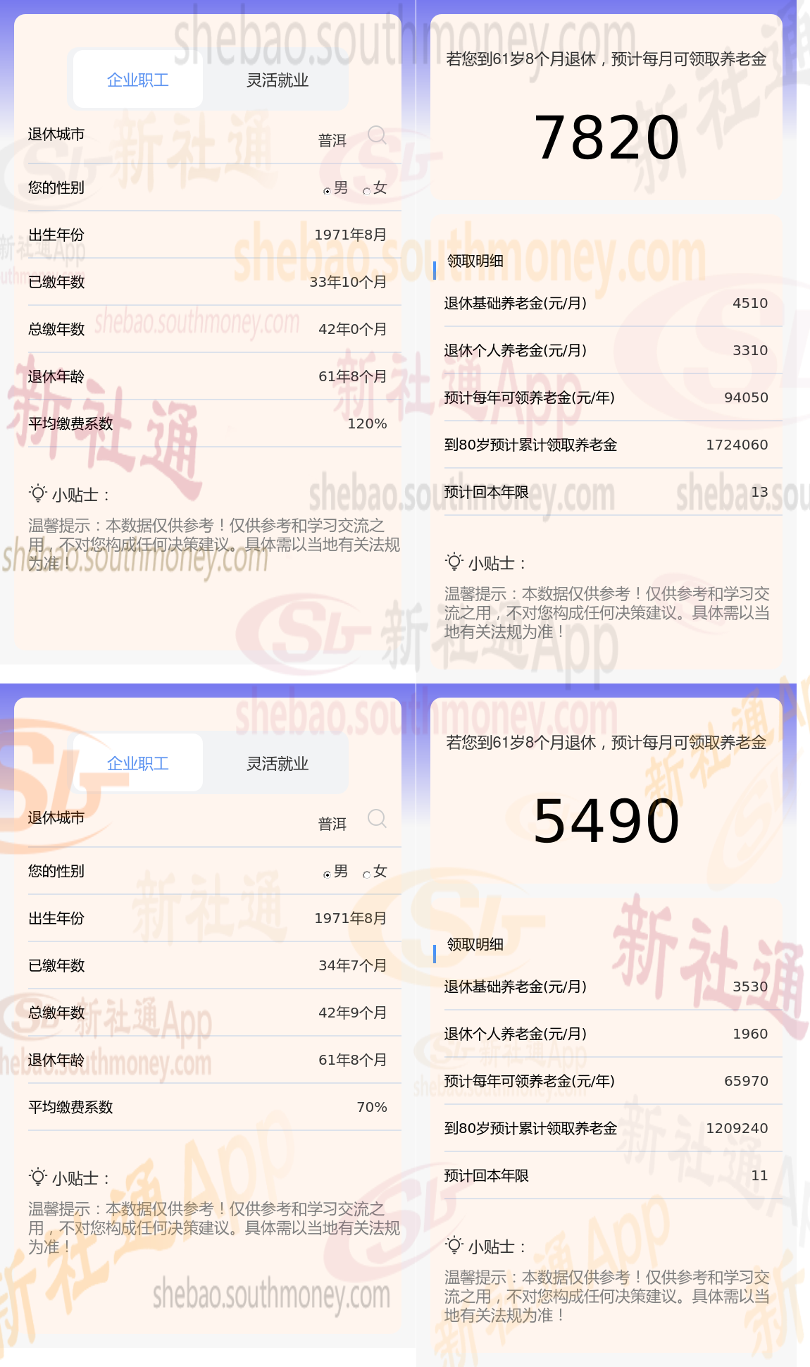 老王:退休城市普洱,缴费年限42年,退休年龄61周岁,但是按70%缴纳社保。