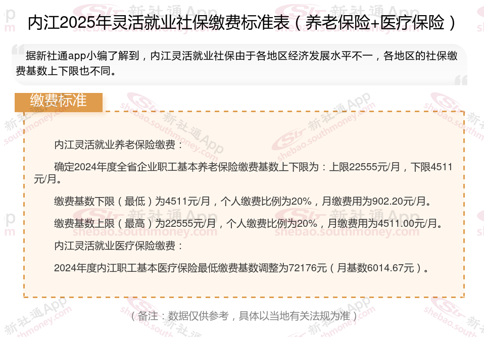 据新社通app数据显示,内江灵活就业养老保险的缴费基数为:4511元。灵活就业人员参保缴费的比例为个人20%。