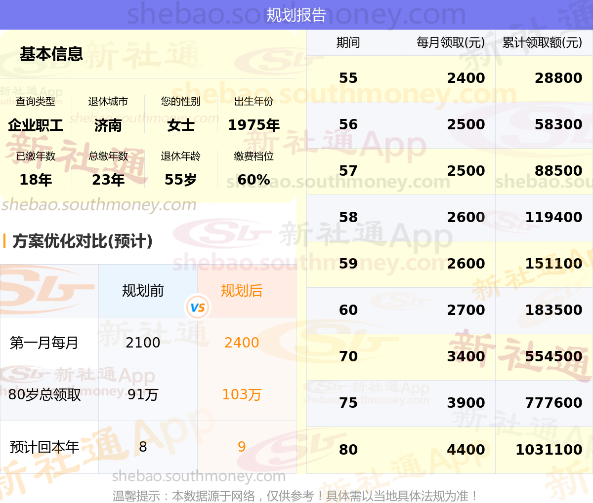 规划前:参保城市:山东济南,性别:女士,出生年月:1975,已缴年限:18年,总缴年数:23年,退休年龄:55岁,缴费档位:60%。