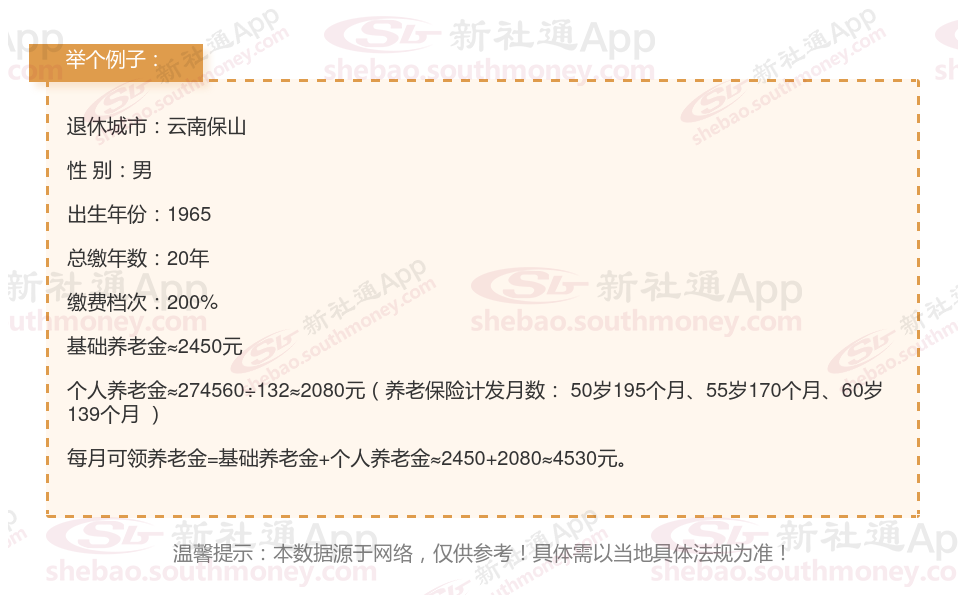 吕某,退休地云南保山,出生于1965年,工龄20年,男性,缴费按200%档次。岁月流转,他终于迎来了自己的退休年龄。根据新社通app养老金在线计算器计算所得: