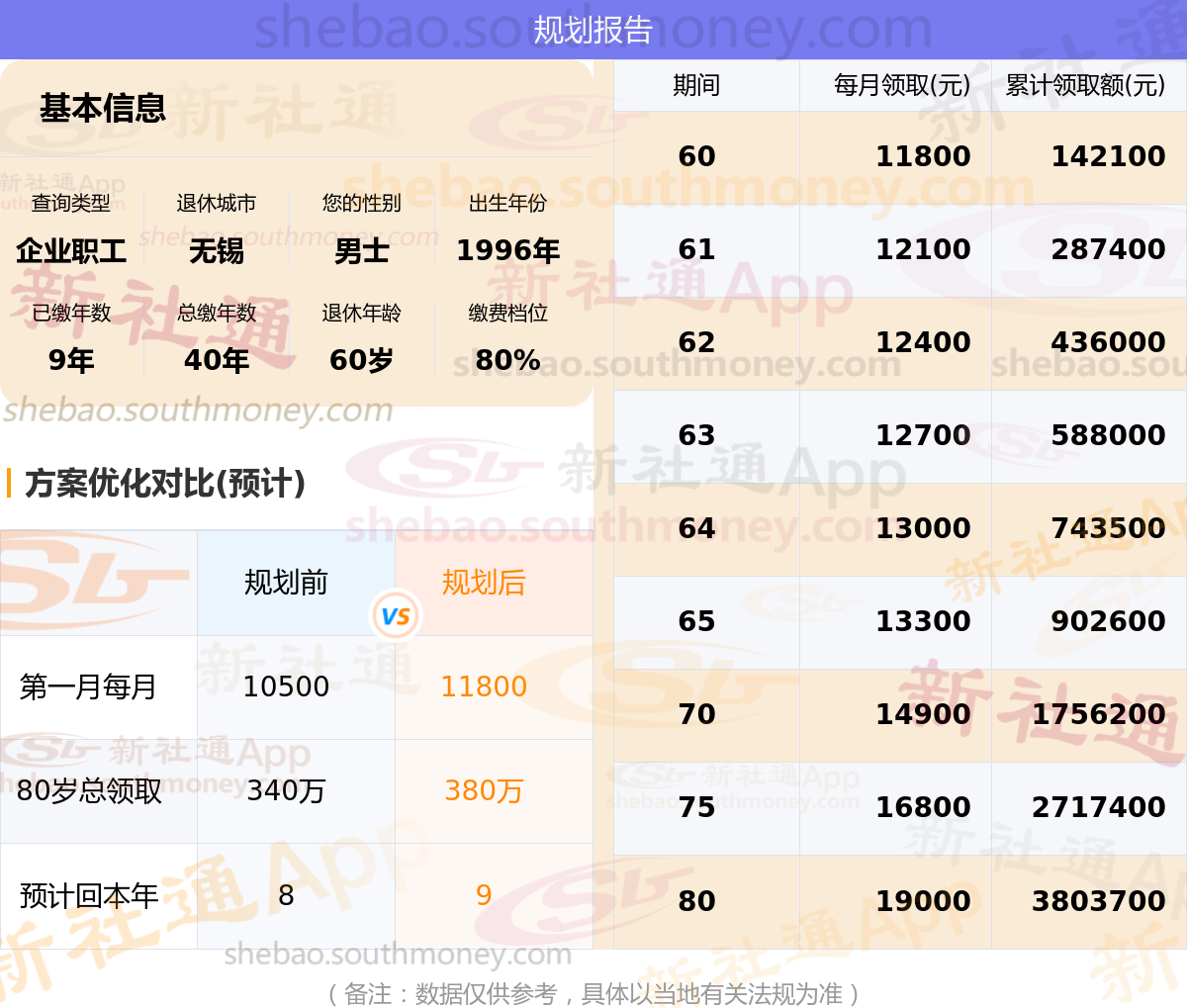 规划前:参保城市:江苏无锡,性别:男士,出生年月:1996,已缴年限:9年,总缴年数:40年,退休年龄:60岁,缴费档位:80%。