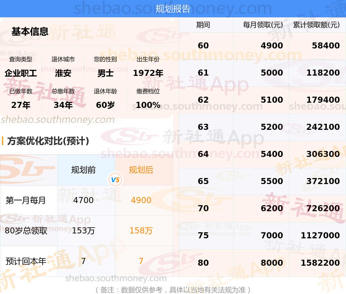 规划前:参保城市:淮安,性别:男士,出生年月:1972,已缴年限:27年,总缴年数:34年,退休年龄:60岁,缴费档位:100%。