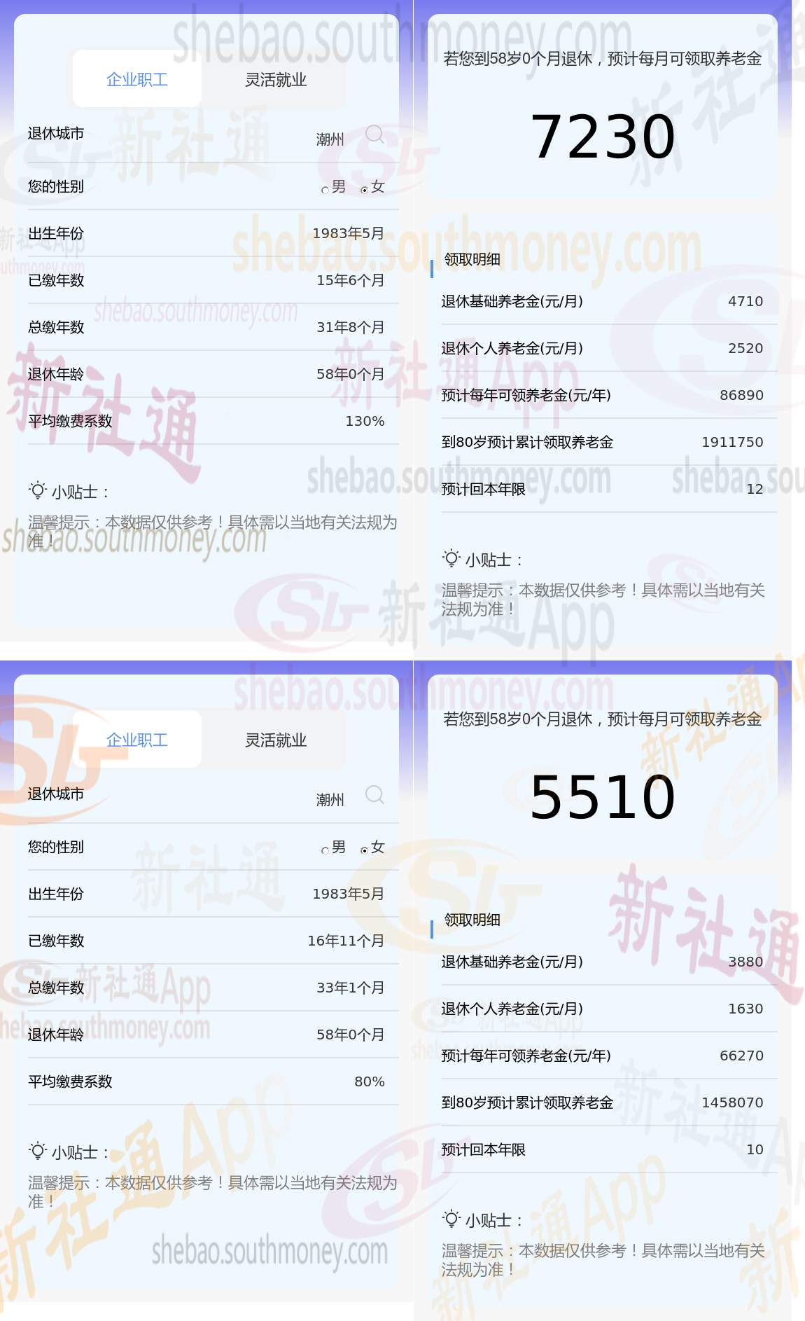 老冯:退休城市潮州,缴费年限33年,退休年龄58周岁,但是按80%缴纳社保。