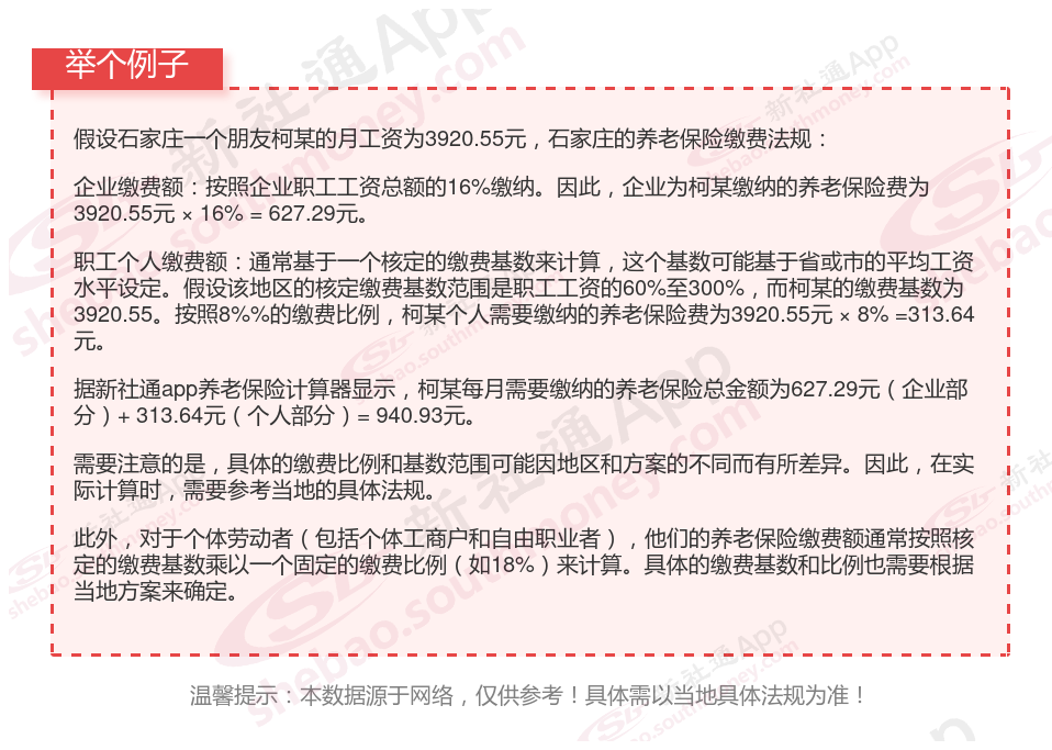 据新社通app获悉,石家庄的养老保险缴费金额因个人情况而异,包括个人缴费基数、缴费比例等因素。以下是一些参考信息:
