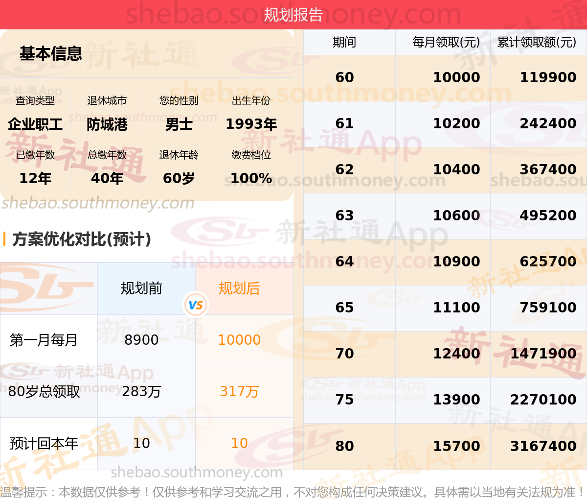 规划前:60岁第一个月约领8900元,新社通APP-养老金规划后:60岁第一个月约领10000元