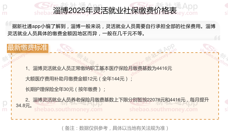2、淄博灵活就业人员养老保险月缴费基数上下限分别暂按22078元和4416元,每月提升34.8元。
