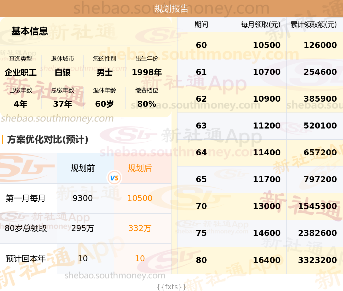 规划前:参保城市:白银,性别:男士,出生年月:1998,已缴年限:4年,总缴年数:37年,退休年龄:60岁,缴费档位:80%。