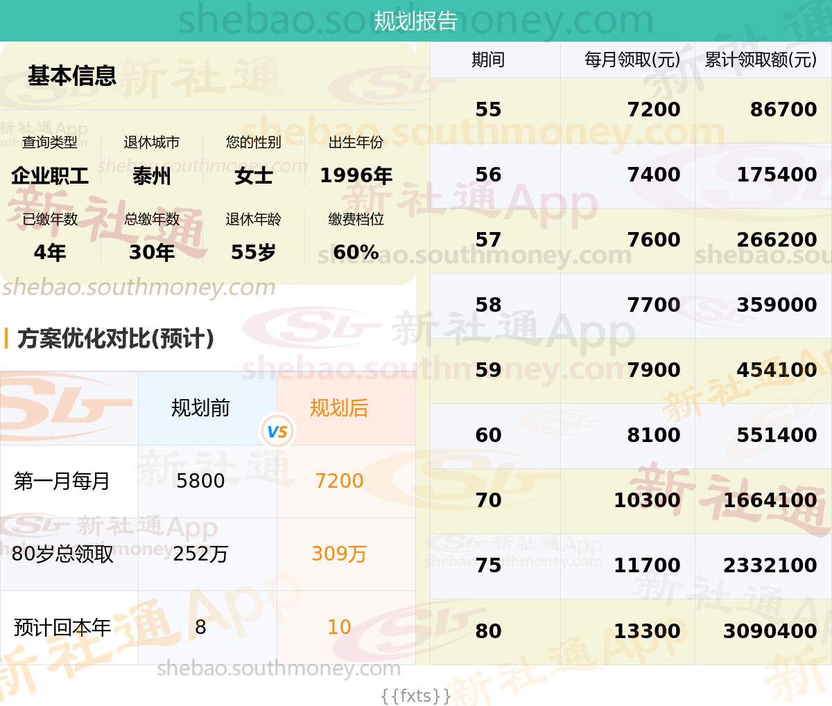 规划前:55岁养老金约5800元,新社通APP-养老金规划后:55岁养老金约7200元