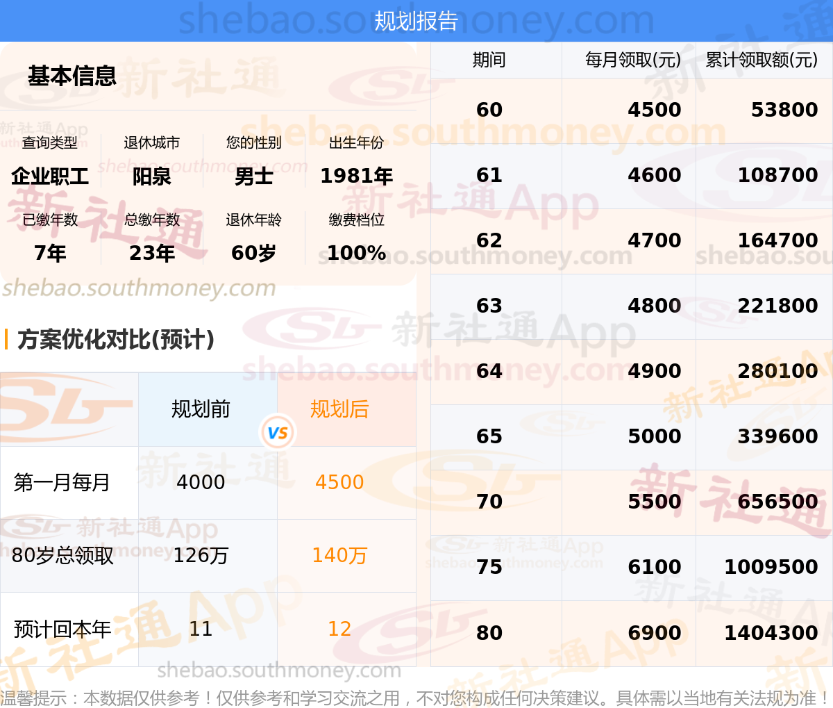 规划前:60岁第一个月约领4000元,新社通APP-养老金规划后:60岁第一个月约领4500元