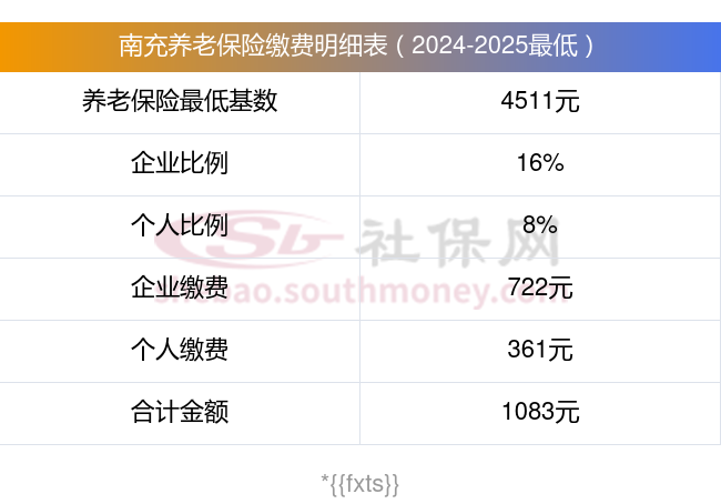 南充养老保险最低缴费基数:4511元;