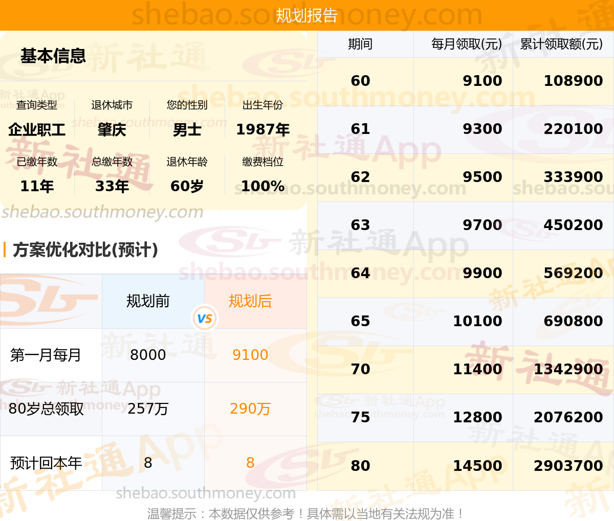 规划前:参保城市:肇庆,性别:男士,出生年月:1987,已缴年限:11年,总缴年数:33年,退休年龄:60岁,缴费档位:100%。