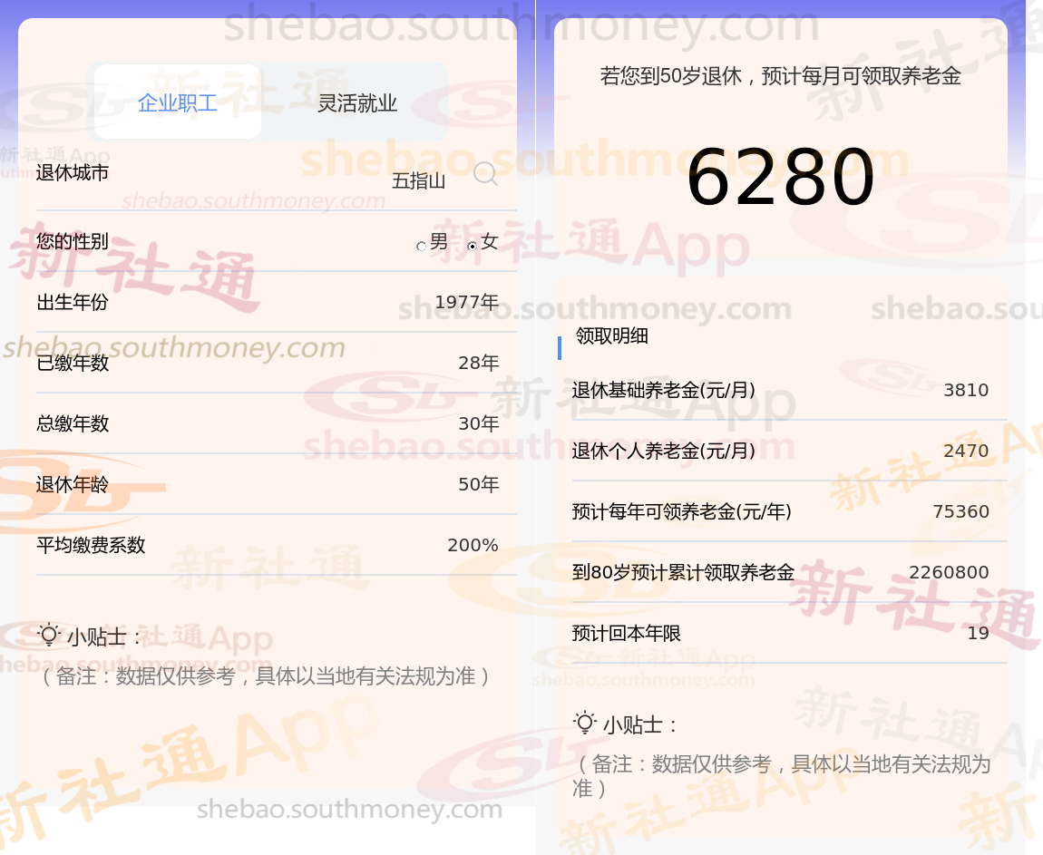 通过新社通APP-养老金计算所得:假设都在五指山退休、出生年份、退休年龄和缴费系数均保持不变的情况下,若个人的社保缴费年限累计达到30年,那么其相关计算方式如下: