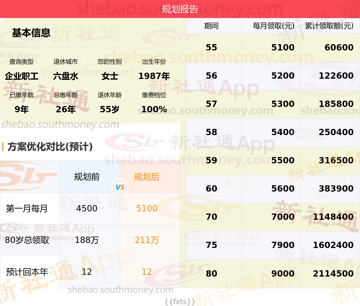 规划前:55岁第一个月约领4500元,新社通APP-养老金规划后:55岁第一个月约领5100元