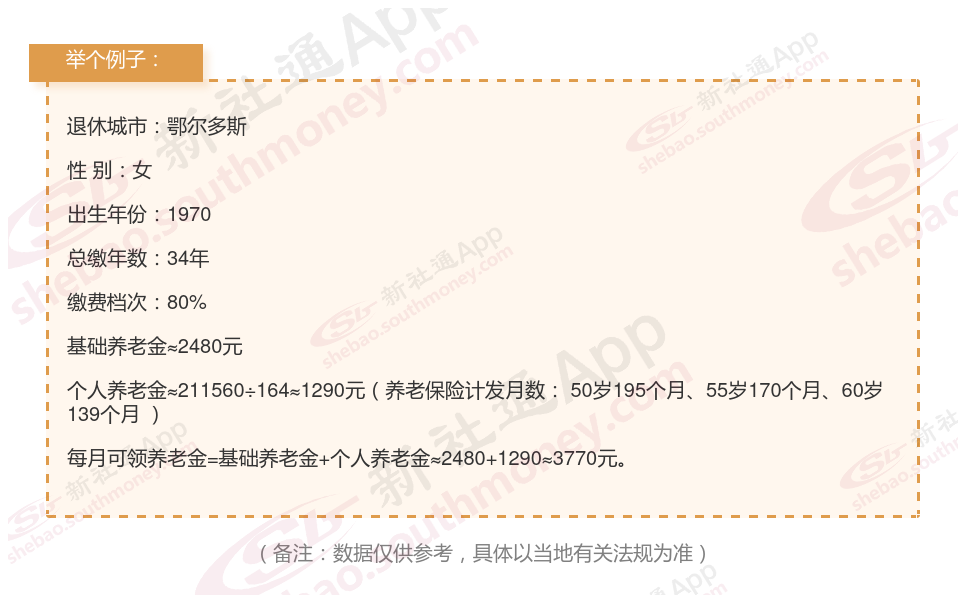 个人档案:女性,1970年出生,鄂尔多斯退休职工,社保缴费34载,档次80%。