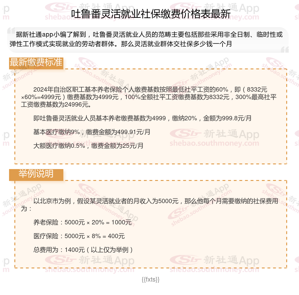据新社通app数据显示,吐鲁番灵活就业养老保险最低缴费基数为:4999元;个人的缴费比例分别为:20%;