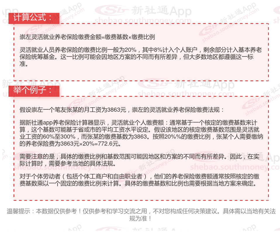 据新社通app显示,崇左灵活就业养老保险最低缴费基数为:3863元;个人的缴费比例分别为:20%;