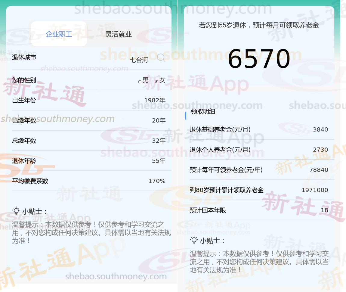 通过新社通APP-养老金计算所得:退休城市、出生年份、退休年龄、缴费系数都相同的情况下,社保缴费年限累计32年时,计算如下: