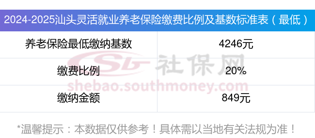 据新社通app显示,2024-2025年汕头灵活就业人员养老保险的缴费标准: