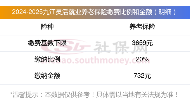 灵活就业人员的社保缴费金额受到多种因素的影响,包括个人收入、缴费基数、缴费比例以及所在地区的具体方案。那么,九江2024-2025灵活就业养老保险社保缴费价格表,灵活就业养老保险一个月多少钱?下面随新社通小编一起来看看详情吧。