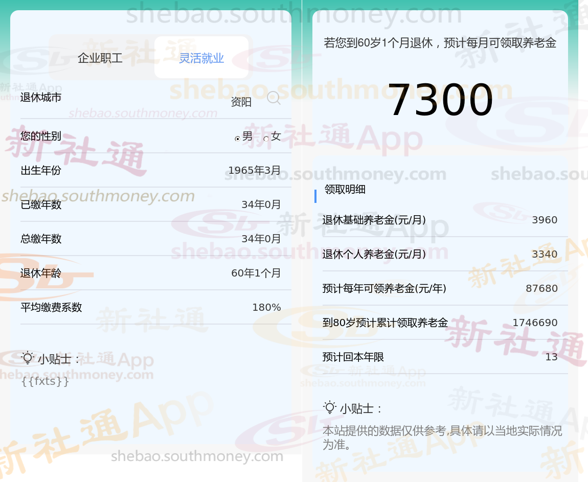 同事谢某退休城市在资阳,性别:男,出生年份:1965,总缴年数34年,缴费档次:180%,新社通app养老金计算器所得:
