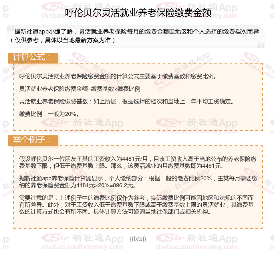 据新社通app显示,2024-2025年呼伦贝尔灵活就业人员养老保险的缴费标准是根据缴费基数来确定的: