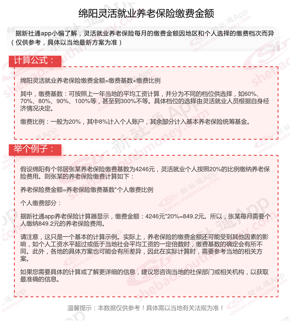 据新社通app显示,绵阳灵活就业养老缴费基数明细如下:
