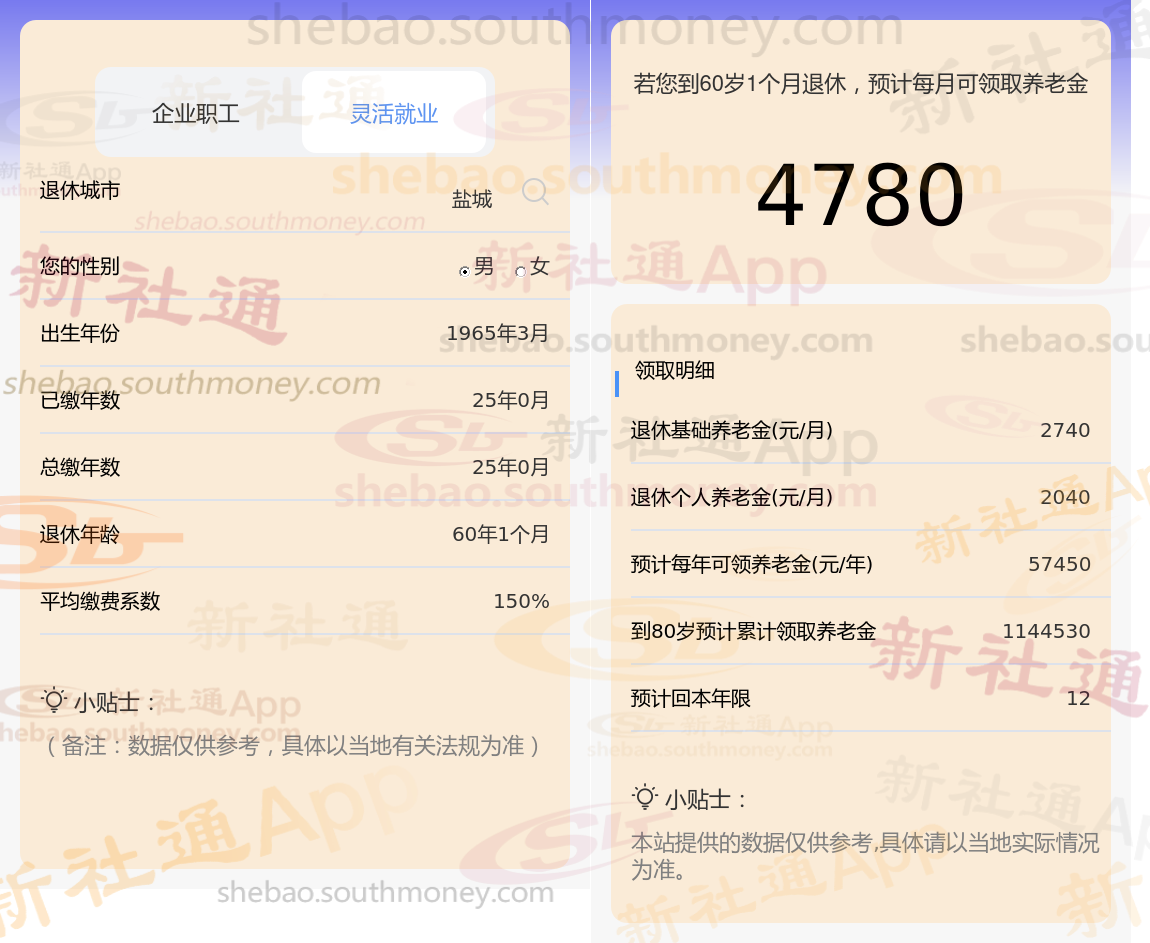 退休城市:江苏盐城,性别:男,出生年份:1965,总缴年数25年,缴费档次:150%,新社通app养老金计算器所得: