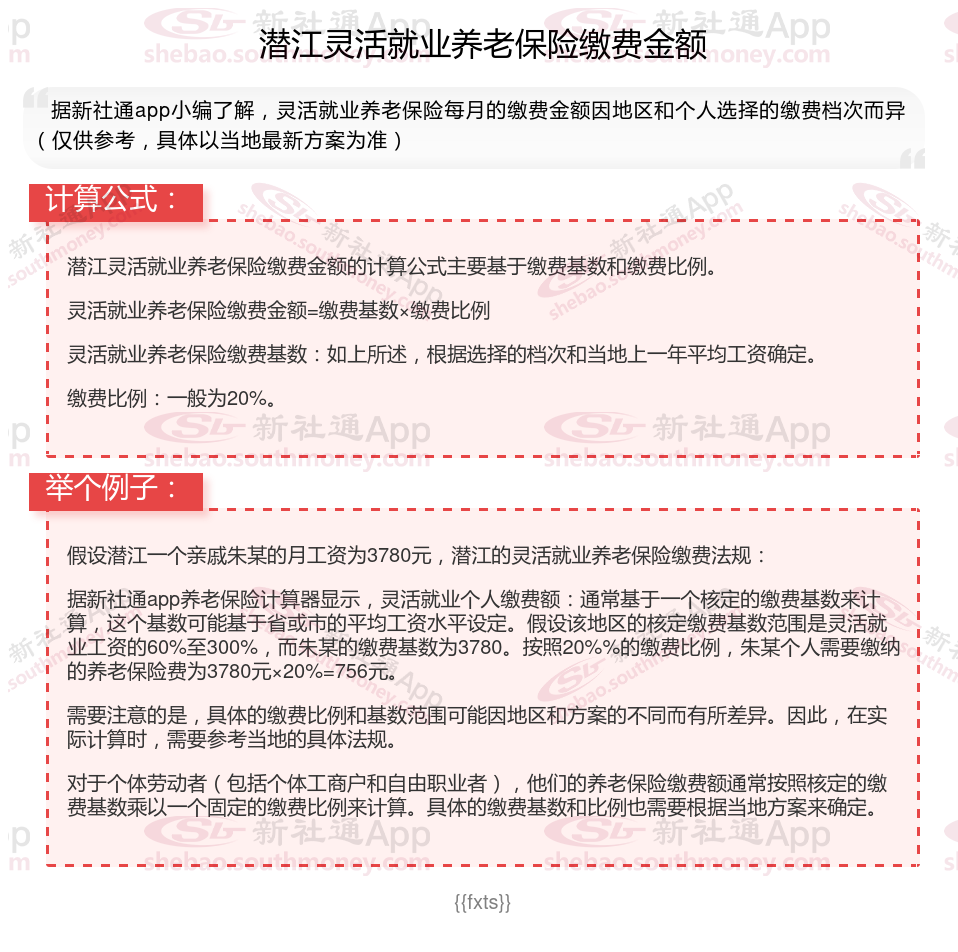 据新社通app小编了解,2024年的灵活就业社保缴费价格表因地区而异,不同城市有不同的缴费标准和方案。下面随新社通小编一起来看看潜江2024-2025灵活就业养老保险社保缴费价格表,灵活就业养老保险一个月多少钱的详情吧。