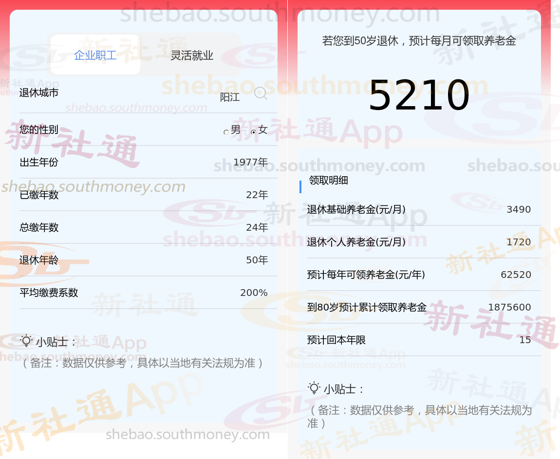 通过新社通APP-养老金计算所得:退休城市、出生年份、退休年龄、缴费系数都相同的情况下,社保缴费年限累计24年时,计算如下: