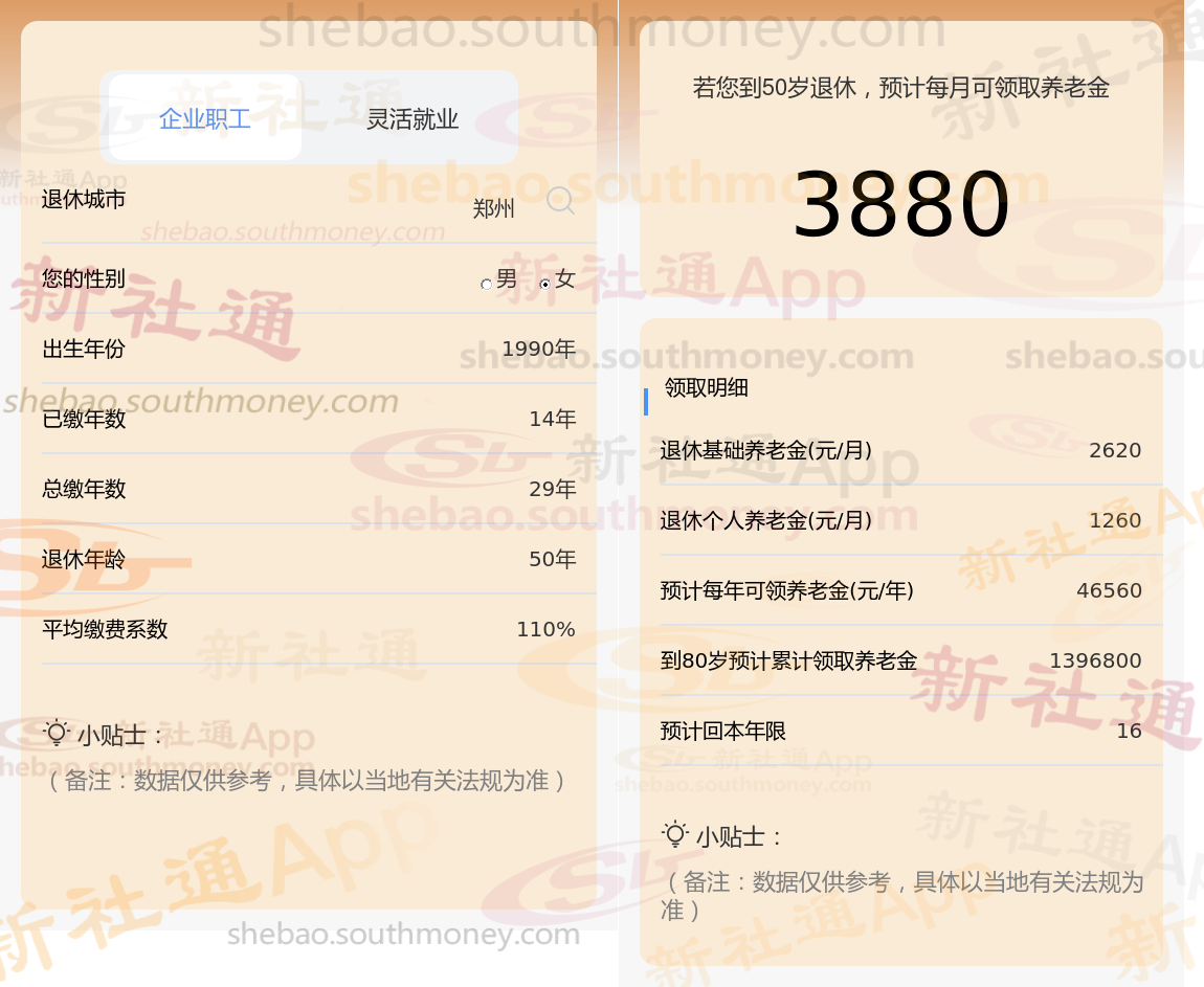 通过新社通APP-养老金计算所得:退休城市、出生年份、退休年龄、缴费系数都相同的情况下,社保缴费年限累计29年时,计算如下: